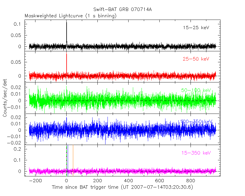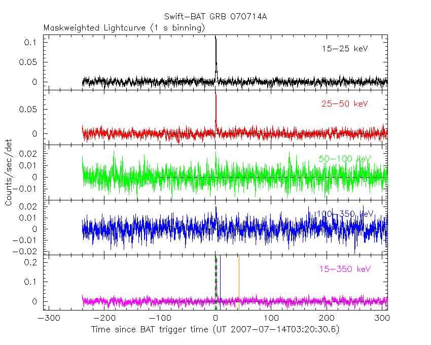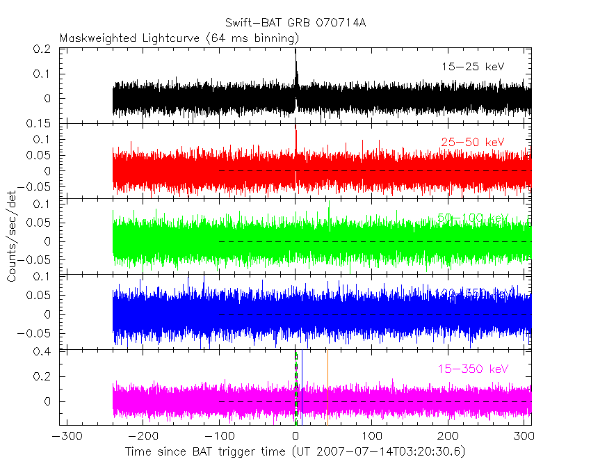 - 4) The verticle lines correspond to following: green dotted lines are T50 interval, black dotted lines are T90 interval, blue solid line(s) is a spacecraft slew start time, and orange solid line(s) is a spacecraft slew end time.